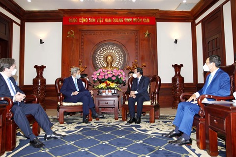 | Le secrétaire du Comité du Parti de Hô Chi Minh-Ville, Nguyên Van Nên (droite), et l'envoyé spécial du président américain pour le climat, John Kerry, le 25 février. |