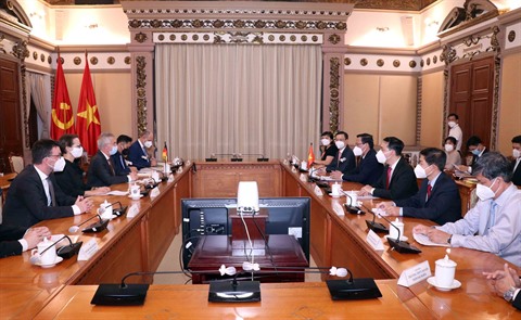 | Lors de la séance de travail entre le président du Comité populaire de Hô Chi Minh-Ville, Phan Van Mai, et le maire de Francfort, Peter Feldmann. |
