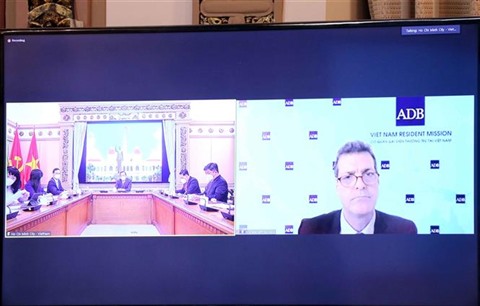 | Réunion en ligne le 23 octobre entre le président du Comité populaire de Hô Chi Minh-Ville, Phan Van Mai, et le directeur national de la BAD au Vietnam, Andrew Jeffries (droite). |