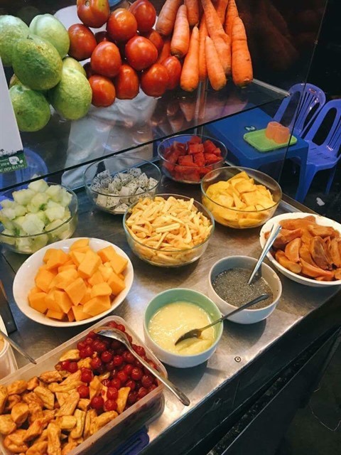Ici, c’est le royaume des fruits. Initialement, la "Rue aux assiettes de fruits" n’avait seulement que quelques échoppes. Peu à peu, avec la "bonne réputation", les convives s’y sont retrouvés en grand nombre et le nombre d’échoppes a cru de manière exponentielle. Il y a toutes sortes de fruits : ananas, melon d’eau, mangue, prune, prunier de cythère, goyavier, noix de coco, longane, fruit du dragon, sapotille, durian..., ainsi que 3 principes invariables : délicieux, nourrissants, pas cher. Chaque assiette de fruit de la rue Nguyên Canh Chân a souvent de 5 à 6 fruits coupés en parallépipèdes, couverts de glace pillée, de sirop et/ou de lait, avec de la noix de coco. Les composants sont identiques, mais chaque échoppe veille à la fraîcheur de ses fruits, au volume lait et de sirop, et à la douceur de la noix de coco.