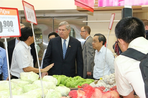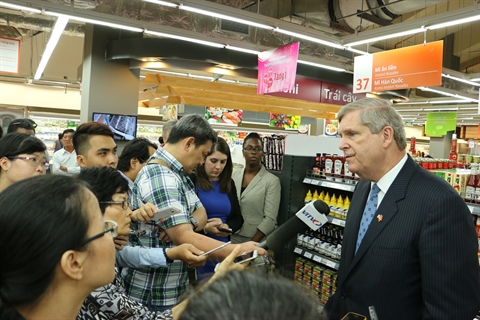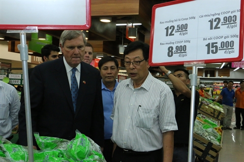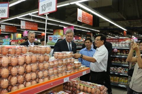 | Le secrétaire américain à l’Agriculture visite le rayon des œufs. Selon lui, lorsque le partenariat transpacifique entrera en vigueur, l’économie agricole du Vietnam progressera fortement, la chaîne de distribution s’améliorera, et les denrées alimentaires acquerront plus de valeur ajoutée. |