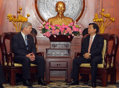 | Dinh La Thang (droite) et Thomas J. Vilsack, le 26 avril à Hô Chi Minh-Ville. |