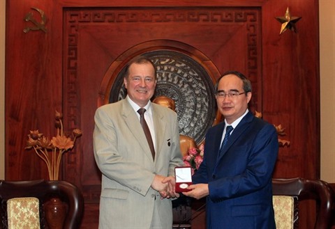 | Le secrétaire du Comité du Parti pour Hô Chi Minh-Ville, Nguyên Thiên Nhân (à droite), et l’envoyé spécial du gouverneur de Saint-Pétersbourg, Katanandov Sergey Leonidovich, le 29 juin. |