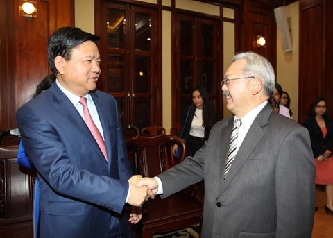 | Le secrétaire du Comité du Parti de Hô Chi Minh-Ville, Dinh La Thang (gauche), et le maire de San Francisco, Edwin Lee, le 6 mars dans la mégapole du Sud. |