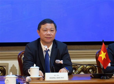 | Le vice-président du Comité populaire de Hô Chi Minh-Ville, Duong Anh Duc, lors de son entretien virtuel avec la vice-maire de Shanghai, Zong Ming. |