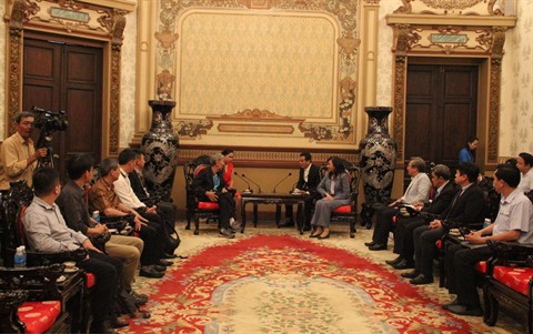 | La vice-présidente du Comité populaire de Hô Chi Minh-Ville, Nguyên Thi Thu (droite), et Sieh Kok Chi, secrétaire général adjoint du Conseil olympique de Malaisie (COM), le 23 mai dans la mégapole du Sud. |