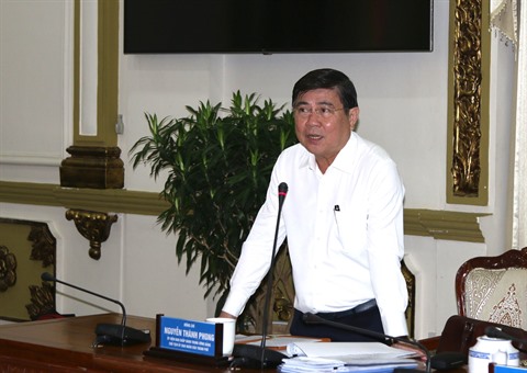 | Le président du Comité populaire municipal Nguyên Thành Phong lors de la réunion de la Direction municipale de lutte contre la pandémie de coronavirus dans la communauté tenue le 26 mars. |