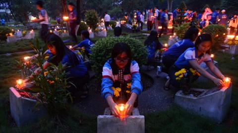 | Les jeunes ont allumé des bougies à la mémoire des héros morts pour la Patrie dans le cimetière de Hô Chi Minh-Ville. |