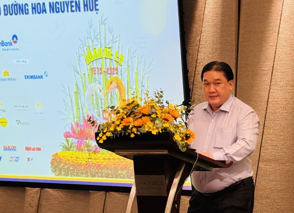 | Le directeur général Truong Duc Hùng de Saigontourist s'exprime lors de la conférence annonçant les activités de la rue florale Nguyên Huê 2025. |