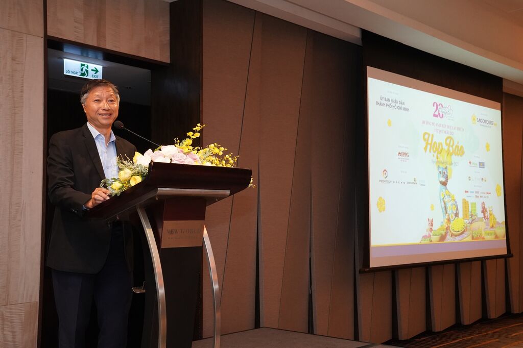 | Le directeur général adjoint de Saigontourist Group, Nguyên Dông Hoa, lors de la conférence de presse de présentation de la rue florale Nguyên Huê 2023. |