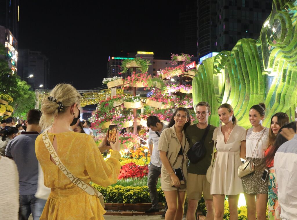 | Visiteurs découvrant la rue florale Nguyên Huê en 2022. |