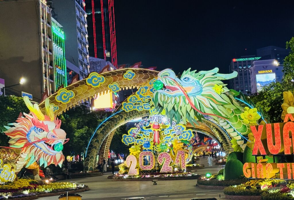 Un point fort de la rue florale de cette année était une paire de dragons baptisée "Luong Long Triêu Liên" (deux dragons flanqués d’un lotus) à la grande porte d'accueil. Chacun s’enroulait des deux côtés de la rue florale, avec une longueur de plus de 100 m et un tour de tête de plus de 2 m. La rue florale Nguyên Huê 2024 a utilisé près de 100 types de fleurs pour plus de 90.000 paniers.