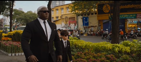 | Le jeune cerveau criminel Artemis Fowl II (droite) et son majordome se pavanent dans les rues de Hô Chi Minh-Ville. |