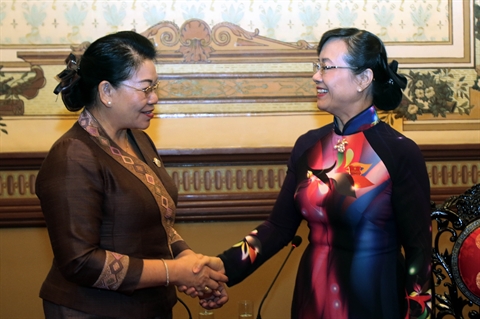 | La secrétaire adjointe du Comité du Parti et présidente du Conseil populaire de Hô Chi Minh-Ville, Nguyên Thi Quyêt Tâm (droite), et la vice-présidente du Conseil populaire de Vientiane, Khamphong Phumvongxay, le 22 août dans la mégapole du Sud. |