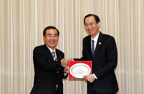 | Lê Thanh Liêm, vice-président permanent du Comité populaire de Hô Chi Minh-Ville, et Hiroyuki Mori, maire de la ville japonaise de Kagoshima (gauche). |