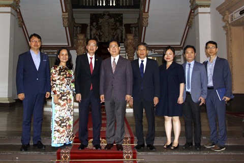 | Le vice-président permanent du Comité populaire de Hô Chi Minh-Ville, Lê Thanh Liêm (3e à gauche), et le secrétaire général de la NEAR, Jong-Kyoung Hong (4e à gauche), le 26 juillet dans la mégalopole du Sud. |