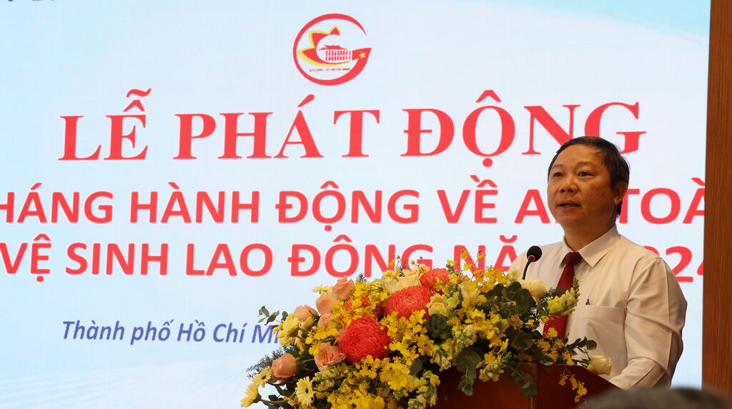 | Duong Anh Duc prenant la parole lors de la cérémonie de lancement du Mois d'action sur la sécurité et l'hygiène au travail 2024. |