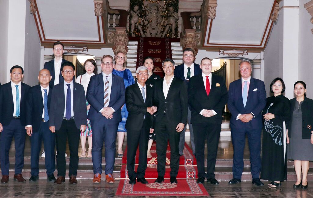 | Le vice-président du Comité populaire de Hô Chi Minh-Ville, Vo Van Hoan (1er plan, 5e à gauche) et l’ancien vice-chancelier, ancien ministre de la Santé et ministre de l’Économie et de la Technologie d’Allemagne, Philipp Rösler (1er plan, 5e à droite), et les délégués posent pour une photo de groupe. |