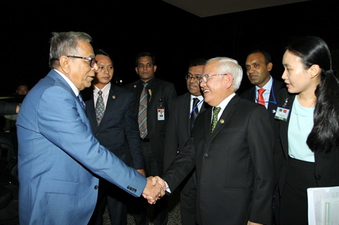 | Le président du Comité populaire de Hô Chi Minh-Ville, Lê Hoàng Quân (droite), serre la main au président du Bangladesh, Abdul Hamid, le 12 août dans la mégapole du Sud. |