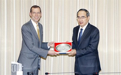 | Le secrétaire du Comité du Parti de Hô Chi Minh-Ville, Nguyên Thiên Nhân (droite), reçoit le 15 janvier, Douglas Elmendorf, doyen de la John F. Kennedy School of Government. |