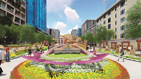 Plus loin, on découvre des maquettes d’ouvrages architecturaux exceptionnels de la mégapole du Sud nichées dans le calice d’une fleur géante de lotus. On peut y trouver en effet des versions miniatures du quai de Nhà Rông (achevé en 1864), du siège du Comité populaire municipal (inauguré en 1909), du marché de Bên Thành (construit au début du XXe siècle), du pont Phú My (le plus grand pont à haubans de la ville, inauguré en 2009).