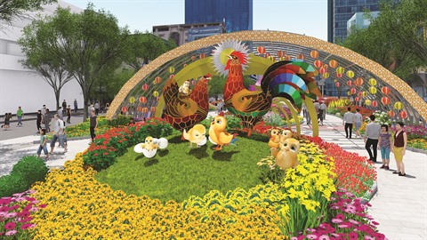 Année du Coq oblige, les visiteurs peuvent trouver aux abords de l’entrée de la rue florale une famille géante composée d’un coq et d’une poule respectivement de 3,5 m et de 2,8 m de haut, et d’une quinzaine de poussins grands de 0,6 m. Le design des gallinacés s’inspire des estampes populaires de Dông Hô (province de Bac Ninh, Nord). Petite surprise : ils sont dotés d’un moteur électrique pour leur permettre de bouger et de chanter. Une petite attention chargée de symboles pour souhaiter aux visiteurs d’excellents vœux pour le Nouvel An.