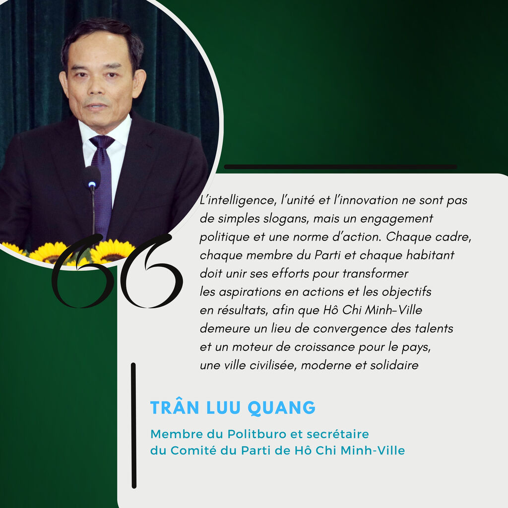 "L’intelligence, l’unité et l’innovation ne sont pas de simples slogans, mais un engagement politique et une norme d’action. Chaque cadre, chaque membre du Parti et chaque habitant doit unir ses efforts pour transformer les aspirations en actions et les objectifs en résultats, afin que Hô Chi Minh-Ville demeure un lieu de convergence des talents et un moteur de croissance pour le pays, une ville civilisée, moderne et solidaire", a-t-il insisté.