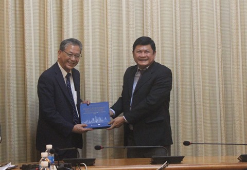 | Le vice-président du Comité populaire de Hô Chi Minh-Ville, Huynh Cach Mang (droite), remet un cadeau souvenir à l'ancien ambassadeur du Japon au Vietnam, Fukuda Hiroshi, le 23 mai. |