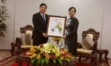 | Nguyên Thi Quyêt Tâm, secrétaire adjointe du Comité du Parti et présidente du Conseil populaire de Hô Chi Minh-Ville, et son homologue de la province du Yunnan, Qiu He, le 26 avril à Hô Chi Minh-Ville. |