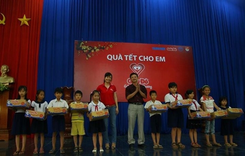 | L’Association de patronage des enfants du Vietnam, en collaboration avec la Compagnie de produits alimentaires A Châu et le journal Thanh Niên, offre des présents à des enfants pauvres. |
