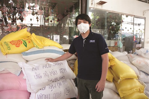 | Hoàng Tuân Anh et le stock de riz remis par les donnateurs à Hô Chi Minh-Ville. |