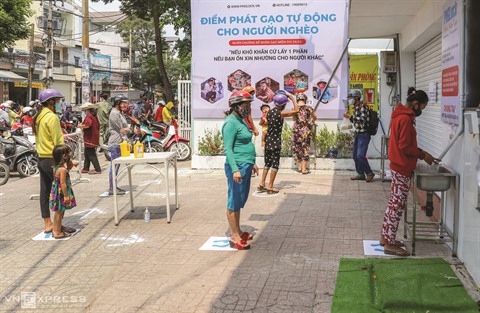 Afin d’assurer la distanciation sociale, les bénéficiaires, dont le nombre ne dépasse pas dix, doivent faire la queue, à une distance de 2 m les uns des autres, dans un carré fixé peint au sol. Tuân Anh mobilise également la présence physique d’un surveillant sur place afin d’éviter toute malhonnêteté : chaque personne n’est en effet autorisée à appuyer et à se rendre sur place qu’une seule fois dans la journée.