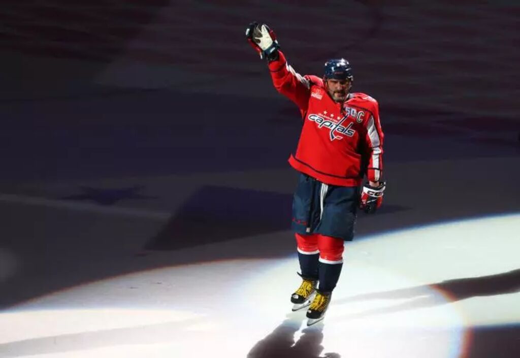 | Alex Ovechkin remercie le public à la fin du match remporté par les Washington Capitals contre les Chicago Blackhawks au cours duquel il a égalé le record de buts en NHL de Wayne Gretzky, le 4 avril 2025 à Washington. |
