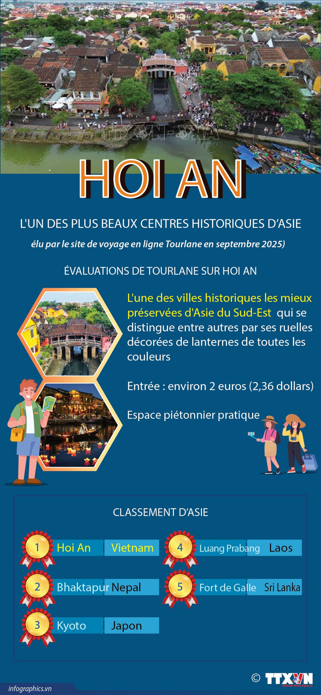 La vieille ville de Hôi An au Vietnam vient d'être classée par le site de voyage en ligne Tourlane comme le plus beau centre historique d'Asie, à égalité avec des sites célèbres du patrimoine mondial tels que Cracovie (Pologne), Avignon (France) ou Carthagène (Colombie).