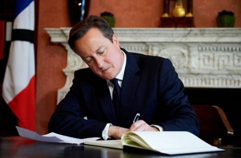 | Le Premier ministre britannique David Cameron signe le registre de condoléances, le 17 novembre à l'ambassade de France à Londres |
