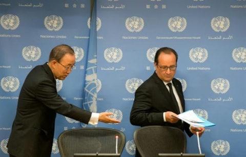 | Le président français François Hollande (droite) et le secrétaire général des Nations unies Ban Ki-moon, le 27 septembre à New York. |