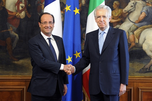 | Le président français François Hollande (gauche) et le chef du gouvernement italien Mario Monti, le 14 juin à Rome. |