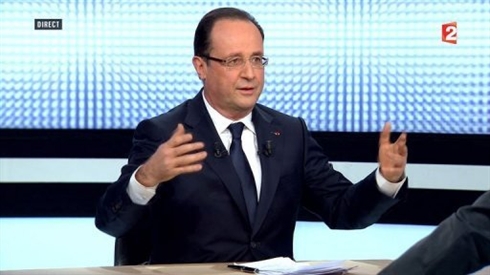 "Ma priorité, je l'ai dit, c'est l'emploi, mais mon cap, c'est la croissance" qui s'annonce nulle cette année, a proclamé le chef de l'État face au journaliste de France 2, David Pujadas sur un plateau austère, une simple table posée dans un vaste décor bleu pâle en arc de cercle. Prévue pour durer 45 minutes, cette première intervention télévisée depuis ses vœux de fin d'année a débordé d'une demi-heure.