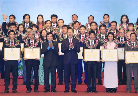 | Le président Trân Dai Quang (1er plan, centre) et des présidents exemplaires de syndicats, le 21 janvier à Hanoï. |