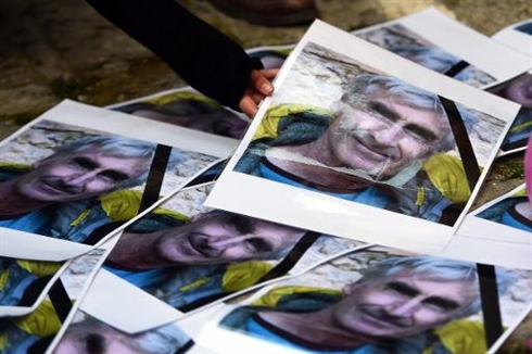 | Des photos d'Hervé Gourdel barrées d'un crèpe noir, déposées lors de l'hommage qui lui a été rendu, le 25 septembre par les habitants de Saint-Martin-Vesubie |