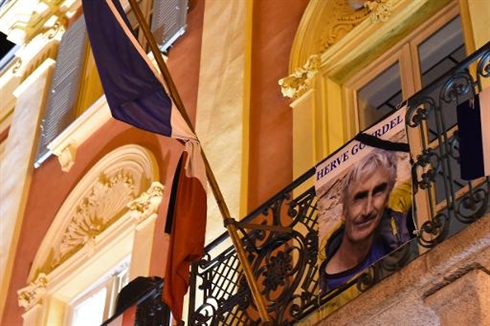 | Drapeau en berne devant une photo d'Hervé Gourdel au balcon de la mairie, le 24 septembre à Saint-Martin-Vésubie |