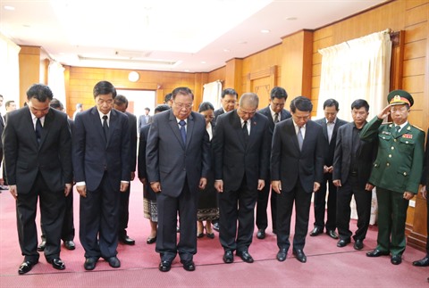 | La délégation laotienne, dirigée par le secrétaire général du Parti et président laotien Bounnhang Volachith (centre), rend hommage à l’ancien président vietnamien Lê Duc Anh, le 3 mai. |