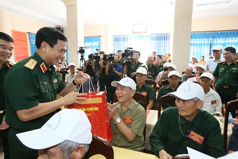 | Le général Phan Van Giang (gauche) remet des cadeaux aux invalides de guerre de la province de Thai Nguyên (Nord), le 14 juillet. |