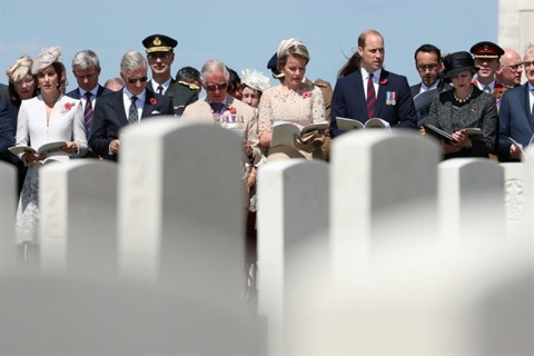 | Des membres des familles royales belge et britannique et la Première ministre Theresa May à Zonnebeke (Belgique) participent à l'hommage solennel pour le centenaire de la sanglante bataille de Passchendaele, en Belgique, le 31 juillet. |