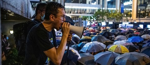 | Des employés de banques et de sociétés financières à Hong Kong manifestent pour soutenir les rassemblements pro-démocratie dans le territoire, le 1er août. |