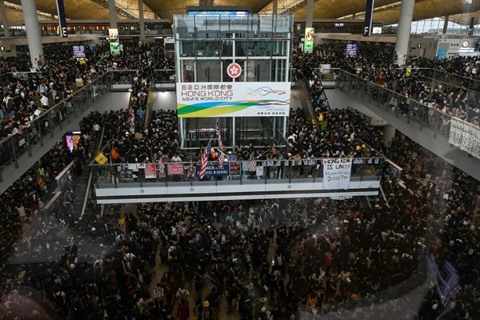 Quelque 5.000 manifestants, selon la police, ont poursuivi lundi 12 août un quatrième jour de sit-in pacifique afin de sensibiliser les voyageurs à leur cause. Certains brandissaient des pancartes où se lisait "Hong Kong n'est pas sûr" ou "Honte à la police". Ils accusent les policiers d'avoir recours à une violence disproportionnée dans le but de réprimer les rassemblements.