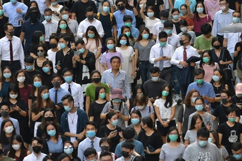 | Rassemblement contre une loi d'urgence interdisant le port du masque lors de manifestations, le 4 octobre 2019 à Hong Kong (Chine). |