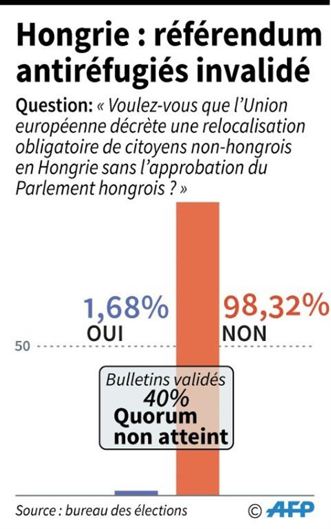 Les Hongrois ont voté ont massivement exprimé (98,32%) leur rejet des relocalisations de réfugiés au sein de l'UE, mais ils n'ont pas été assez nombreux pour que le chef de l'exécutif remporte cette consultation à forte valeur symbolique.