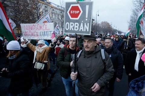 | Un manifestant exprime son opposition au Premier ministre hongrois Viktor Orban lors d'une manifestation à Budapest contre la loi travail. |