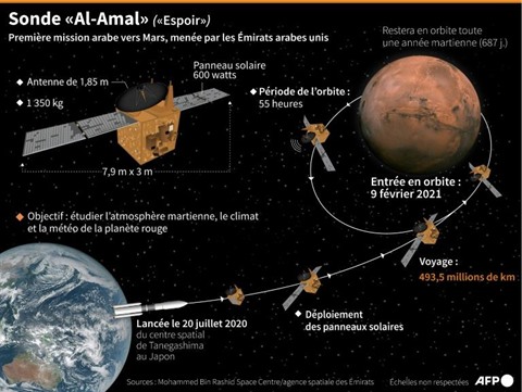 Après son décollage du Japon, la sonde nommée Al-Amal ("Hope" en anglais, "Espoir" en français) est maintenant confrontée à sa manœuvre "la plus critique et la plus complexe", selon les responsables émiratis, avec une chance sur deux de réussir son entrée en orbite.